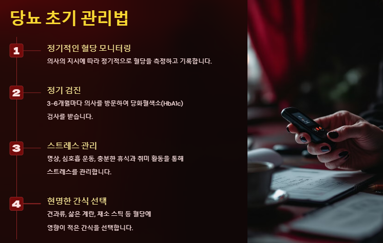 - 정기 검진: 3-6개월마다 의사를 방문하여 당화혈색소(HbA1c) 검사를 받습니다.