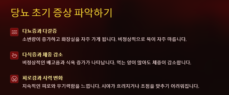 - 다갈증: 비정상적으로 목이 자주 마르고 물을 많이 마시게 됩니다.